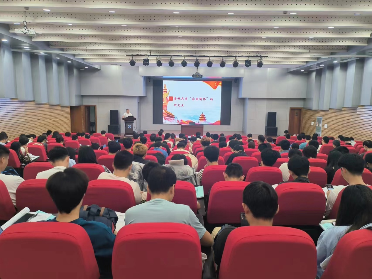 周钢老师结合自身经历,为同学们讲述了学校发展历史,介绍了老一辈矿大人的艰苦奋斗故事,引导同学们感悟历史,赓续传承。他以学校卓越创新人才培养为切入点,为同学们分析了新时代研究生教育变革情况,鼓励同学们珍惜青春时光,养成终身学习习惯,理论联系实际,提升自身科研能力和综合素质。他还以地下空间利用开发等科研热点问题和国家“一带一路”战略为例,分享了党和国家在科研和基础建设方面取得的巨大成就。他表示,希望同学们坚定科研报国的信念,将个人发展与国家战略相结合,做新时代有志有为青年。