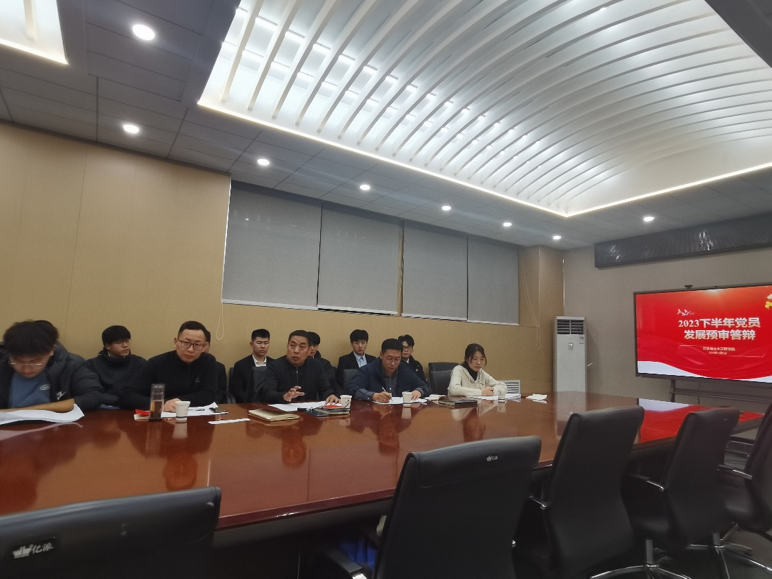 答辩包括个人陈述、现场问答、评委打分、宣读成绩、总结交流五个环节。答辩现场,同学们依次从入党动机、对党的认识、个人综合表现等方面进行了个人陈述。周钢老师和郭晋蒲老师根据学生自身情况并结合党的理论知识,对学生进行了提问。同学们针对评委提出的问题,认真思考,实事求是进行作答,展现出了较强的政治素养和理论水平。在最后的总结交流环节,周钢老师和郭晋蒲老师向同学们分享了自己的入党经历和成长经历,对在场同学提出了要求。他们希望同学们端正入党动机,时刻以党员标准严格要求自己,加强党的理论知识学习,提升个人综合素质能力。