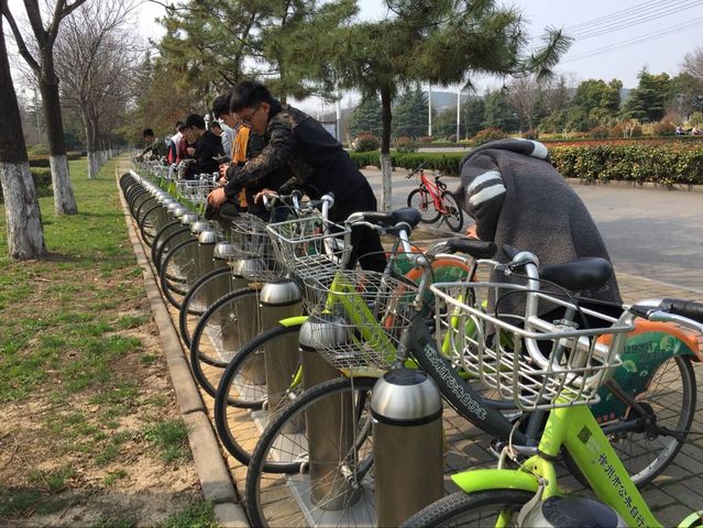 下午1点30分,十七名志愿者在北门集合。集合完毕后,带队人刘伟强分发抹布给各名志愿者。志愿者先将抹布用水浸泡洗净,之后开始清洁自行车。到达第一个公共自行车站点后,志愿者们便迅速地投入到了工作当中,纷纷拿起手中的抹布,弯下腰擦洗车身。同时,志愿者们也不忘将自行车刷卡器也认真清理了一遍。当清洁工作完成后,再前往下一个公共自行车站点。在带队人刘伟强的带领下,十七名志愿者们由三环南路向珠山东路上的云龙湖风景区进发。到达自行车站点时,志愿者们十分默契地穿插在一排整齐地自行车里,认真仔细地擦洗自行车。在到达云龙湖风景区后,带队人带领大家来到公共厕所清洗抹布,志愿者们井然有序地排队等待清洗抹布。大约两个小时后,公共自行车清洁活动顺利结束。