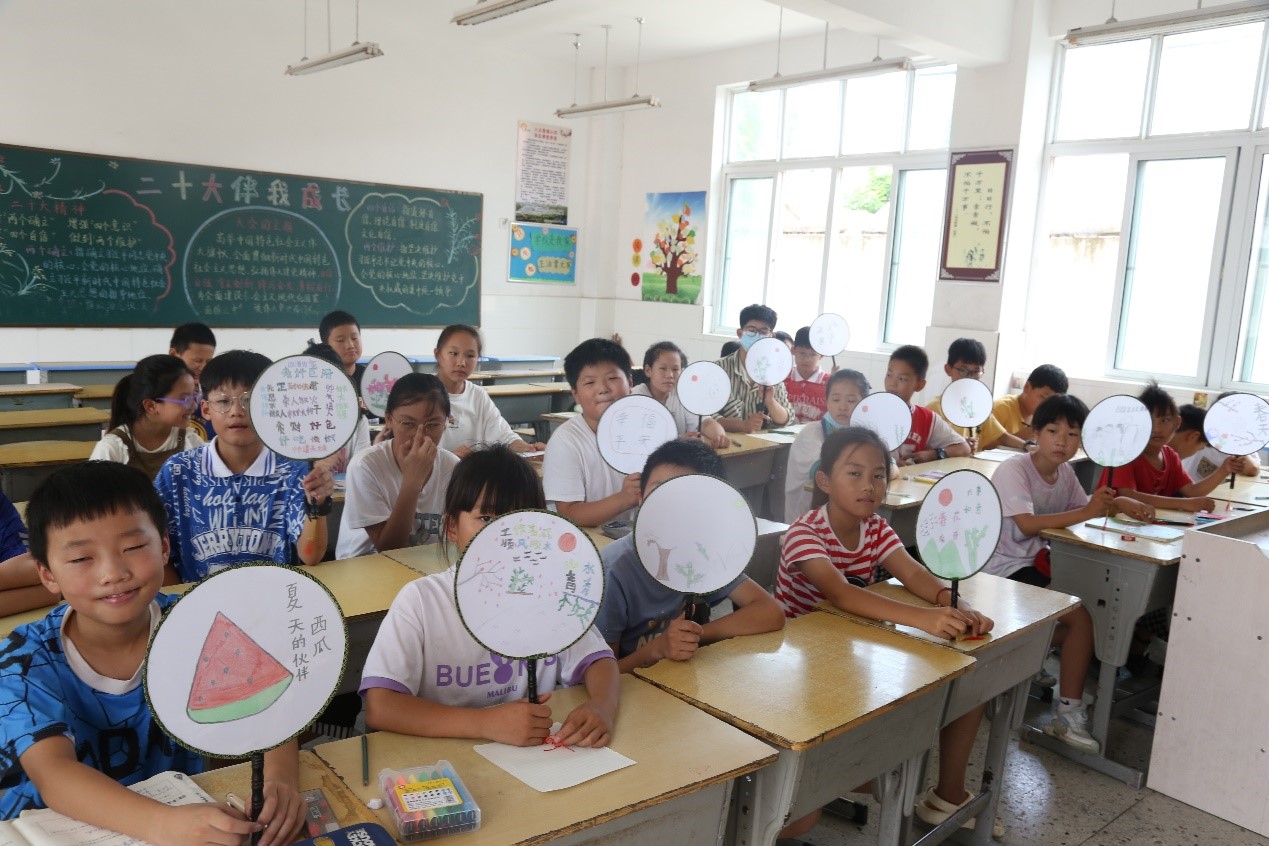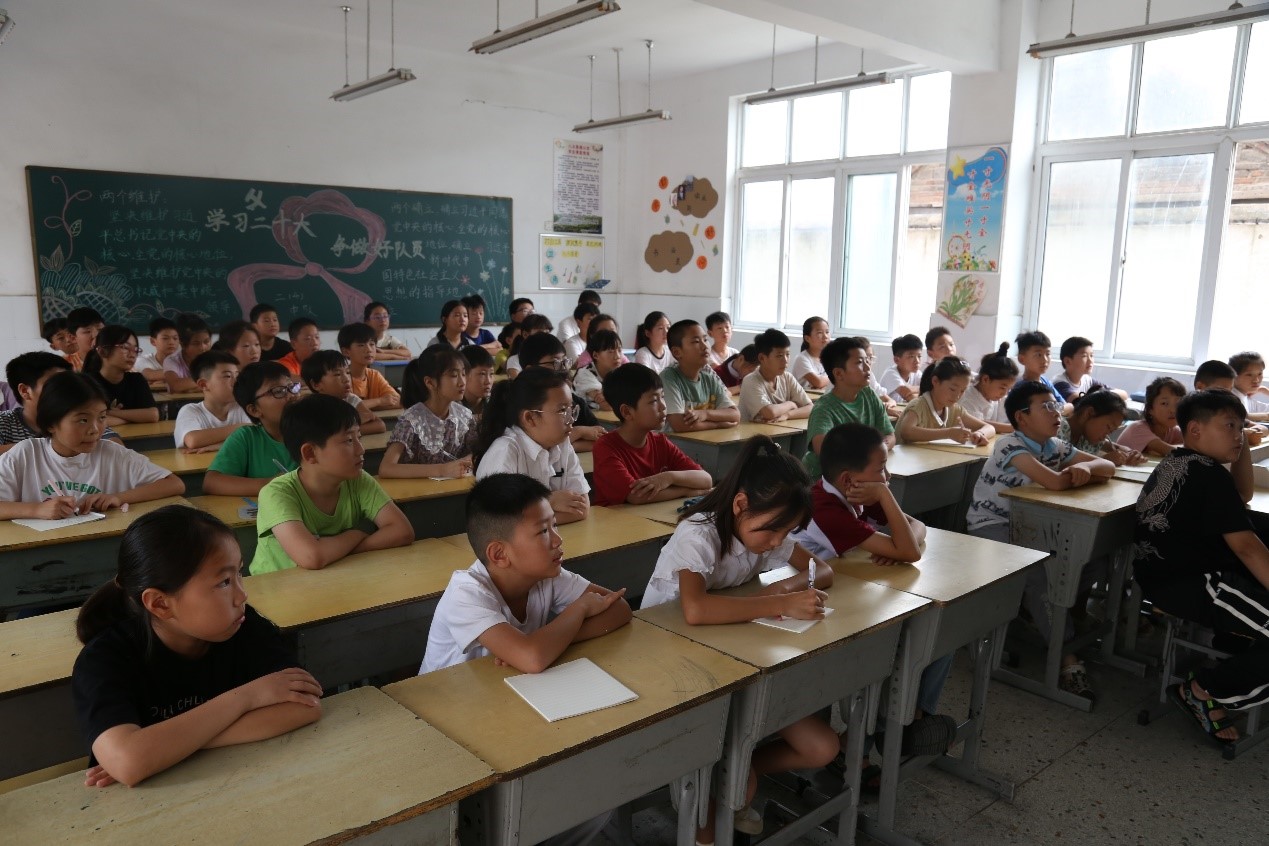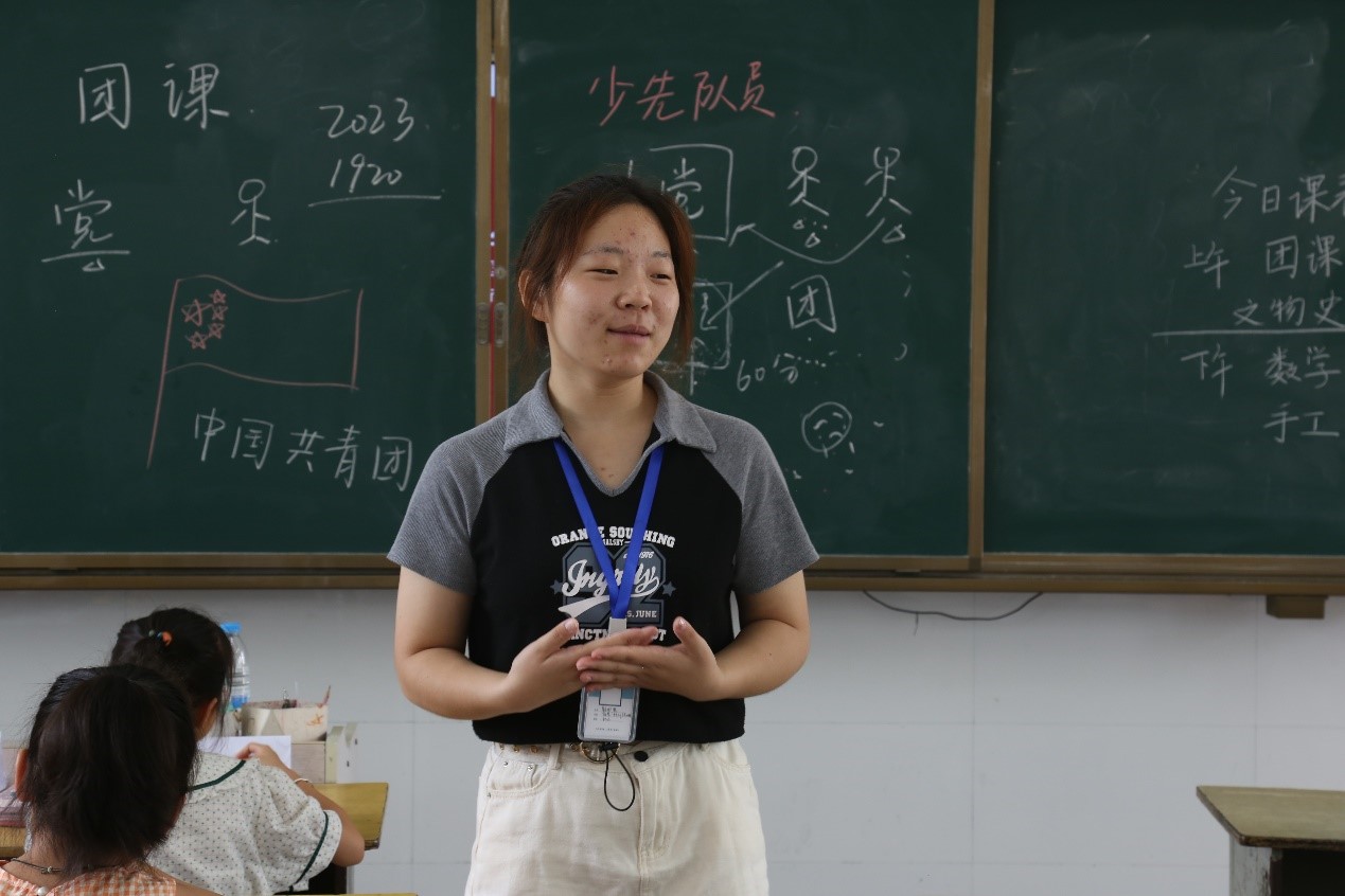本次支教活动一共有五个班级,分别为二年级到六年级,平均每个班有35名学生。上午八点半,第一堂课准时开始,孩子们都按时到达教室,有序就座准备上课。五年级的第一课是陈雨涵同学带来的传统文化课,她利用大量精美的图片介绍了中国的传统刺绣文化。张莹同学在六年级开展的第一课是传统服饰课,她结合图片和视频向孩子们展示了不同时代的服饰特点和相关文化背景。本次支教特色课程——主题团课由队长韩明慧在三年级讲授,她通过介绍“什么是共青团”引入课堂,讲述了共青团的历史、基本组织构架和奋斗目标,随后,韩明慧同学阐释了共青团和少年先锋队的关系,呼吁同学们好好学习,培养能力,爱祖国、爱人民,努力成长为社会主义现代化建设需要的人才。其他年级也进行了美术、手工等课程的教学,让小朋友们学习丰富多彩的课程内容。