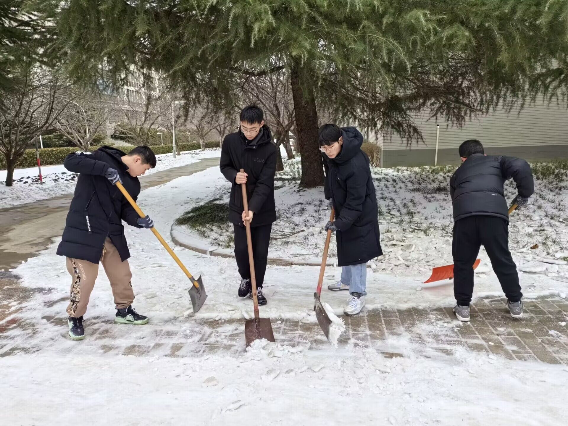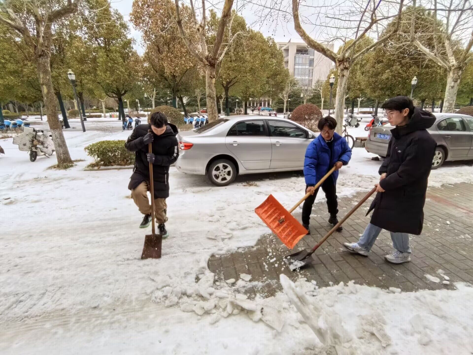 青年志愿者协会迅速响应,发起了扫雪除冰的志愿服务活动。由于气温低,校园道路、宿舍楼门口两侧的积雪被压得很瓷实,下面还结了一层冰,清扫工作十分困难。但志愿者们不畏严寒,纷纷拿起扫帚、铁铲等工具,对校园内的积雪进行了清理,他们有的清扫道路,有的铲除结冰,有的则负责引导同学们安全通行。志愿者们的身影在寒风中显得格外温暖,他们的行动为校园的安全和畅通做出了积极贡献。