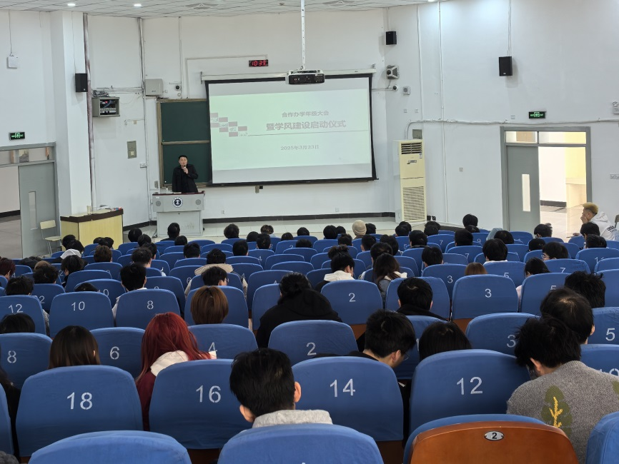 中外合作办学2022级和2023级于博2C102举行合作办学年级大会暨学风建设启动仪式。辅导员陈忠伟、郝辰翎及2022、2023级中外合作办学全体学生参会。