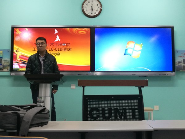 下午4时整,工力16-01班全体班委到场准备班会。下午4时30分,班主任和同学们准时到达,班会正式开始。班长牟恭雨同学首先以幻灯片的形式展示了班级近况,为同学们总结了本学期班级所取得的各项成就,还对集体自习、日常学习、宿舍卫生、本科生导师制等事务进行了详细的分析与总结。同时,对接下来的班级建设做出规划,希望大家“凡事打点提前量”。而针对于下学期即将开始材料力学与分析力学的学习,他提出了紧跟老师思路,把专业课学扎实的号召。紧接着,各班委向同学们汇报了这一学期来各自所做的工作,并坦言了自己在工作中出现的问题,同时也向同学们提出了新的要求,得到了同学们的理解与支持。
