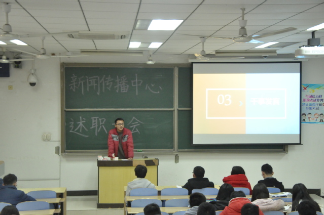 1月17日下午,学院大学生新闻传播中心2017-2018年述职大会在教4A101隆重举行。新传指导老师李亮老师和吴双老师出席了本次大会,新传全体成员参加了本次大会。新传主任王立鹏担任本次大会的主持人。