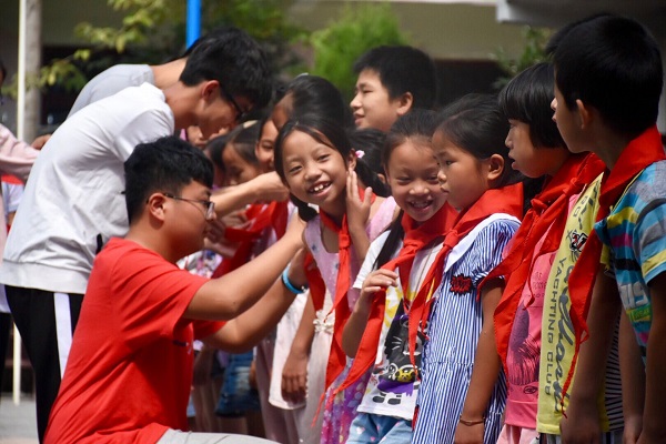上午9点50分,全体人员集合完毕。10点整,升旗仪式准时开始,三分队队员路正一、王之凡作为升旗手迈着铿锵有力的步伐登上了升旗台,伴随着雄壮的国歌声,国旗徐徐升起,全体人员肃然起敬,面向国旗行注目礼。接着,“筑梦”公益第三分队分队长王建军作为支教队员代表进行致辞,他不仅对乡镇府领导以及学校工作人员的支持表达了感谢,还强调本次支教活动的意义不仅是向学生们普及科学文化知识,更是要促进龙盘村的同学们实现多方位多领域的全面发展。随后,“筑梦”公益三分队特针对升旗仪式举行红领巾佩戴环节,各班学生代表有序出列,队员张祎、赵潇艺、李国庆、付尚万、王浩以及隽亚明为他们佩戴红领巾。最后,队员包家欣作为领誓人带领全体师生进行国旗下的宣誓。