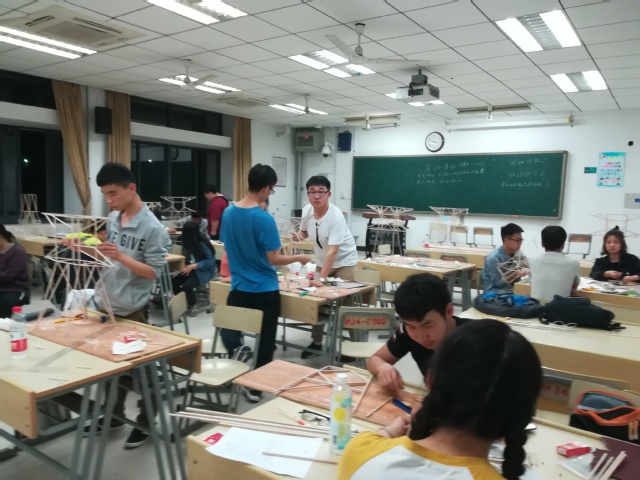 本次结构比赛在模型加载成功的基础上以荷重比评判成绩,专业组旨在提高同学们的动手实践能力,考察学生运用专业知识做出合理、经济的高压输电塔结构模型的能力,拓展学生对于空间结构受力分析的能力,通过不同等级难度的加载,考察模型的稳定性以及称重能力。专业组设计制作模型时间为5月11日晚上7点5月13日早上10点,5月6日下午在学院楼前进行初赛,进行一级二级加载;加载成功的前15组模型晚上七点在学院楼A108进行三级加载的角逐,学院领导张书记和指导老师游洋出席指导了次的加载。同时,为吸引广大非本学院同学参与建筑模型制作,提升对建筑力学结构的认识,此次在专业组赛题外特设趣味组赛题。兴趣组模型制作时间为5月11日晚上起点到5月12日晚上10点结束,5月13日上午在二食堂广场进行加载。模型加载采用静加载的形式完成,所加荷载为屋面全跨均布荷载,荷重用软质塑胶运动地板模拟。