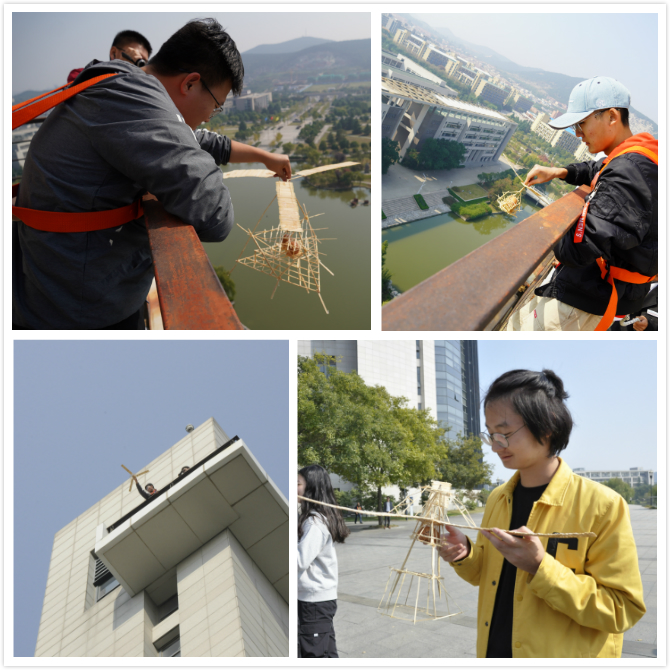 20日上午10时,进入决赛的队伍带着自己的模型到达了他们的决赛战场——图书馆钟楼。在这里,成功晋级的模型将进行最终对决,12层楼的高度考验的不仅是创意更是实力。在经过紧张地放飞以及严格的查验后,根据赛题的折算系数对最终名次做出了评定。最终,来自徐海学院的赢斌宁飞扬小组拔得头筹。