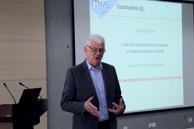 会上,Herbert A. Mang 院士做了从微观材料模型到隧道结构模拟研究的学术报告,题目为 “Bridging the Gap between Concrete Microstructures and Tunnel Linings”。报告介绍了港珠澳沉管隧道建设的相关工程研究,涉及结构-材料多尺度分析,爆炸冲击、高温荷载对结构性能安全性分析,及隧道结点安全性分析等内容。分析中不仅考虑了混凝土微观结构对于结构耐久性的影响,也同时将宏观结构响应反馈至微结构以分析微裂缝的形成。