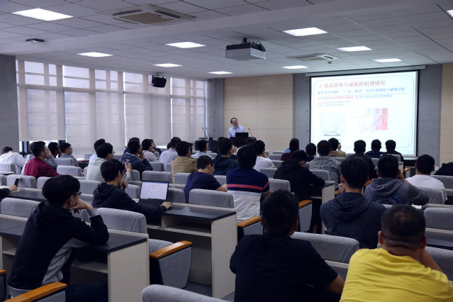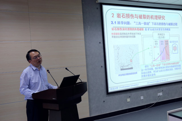 报告会上朱万成教授以“深部三高一扰动”下岩石损伤与破裂过程的科学问题为主线进行了阐述,然后针对这一科学问题介绍了东北大学的研究团队在致灾环境、致灾机理和致灾过程方面研究的三项科研成果:(1)岩石类介质参数及损伤的数值表征方法(岩体表征),通过建立简单的应力-应变本构关系,从细观角度引入weibull分布来真实模拟岩石的不均匀性,基于Matlab 和Comsol 进行了混合编程,可表征岩石特征,(2)热流固耦合作用下岩体损伤演化规律(“三高”环境),揭示了岩体损伤对于采动诱发突水的控制机理,输出了基于损伤演化的突水判据,证实了温度对煤层渗透性的重要影响,阐明了地温场对煤层瓦斯运移的影响机理;(3)采动围岩损伤与破裂机理及致灾过程(开采扰动)。这些研究为揭示致灾机理,剖析致灾过程,为灾害预警及防控提供技术支撑。构建了多应变率条件下岩石损伤演化直至破裂全过程力学模型,发明了一套中应变率动力扰动试验装置,揭示了动态扰动触发深部巷道岩爆机理。在座的师生与朱万成教授进行了深入的交流讨论,为大家开展深部地下工程的研究提供了新的思路。