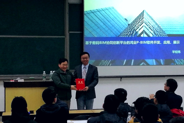 校外兼职硕士研究生导师聘书。受聘仪式后,平经纬副总工程师围绕“BIM正向化设计”的主题进行了讲演,主要对BIM的发展状况和未来发展趋势、BIM信息数据与安全、建筑生命周期、BIM标准、BIM目前在行业中的应用、正向化设计、碰撞检查、规范校验等多方面进行了讲解。同时,平总在讲座上展示了鸿业科技自主研发的基于BIM协同创新平台的鸿业P-BIM软件BIMSpace为同学们拓宽了专业视野,让在场学生对BIM有了一个更深入的了解。据平总介绍,鸿业BIMSpace沿用二维设计习惯,内嵌了好多国家规范、图集、以及大型企业标准,可以实现快速建模、规范校验、碰撞检查、智慧出图,是一款本地化的BIM正向化设计平台,适用于建筑、水暖电、机电深化专业。