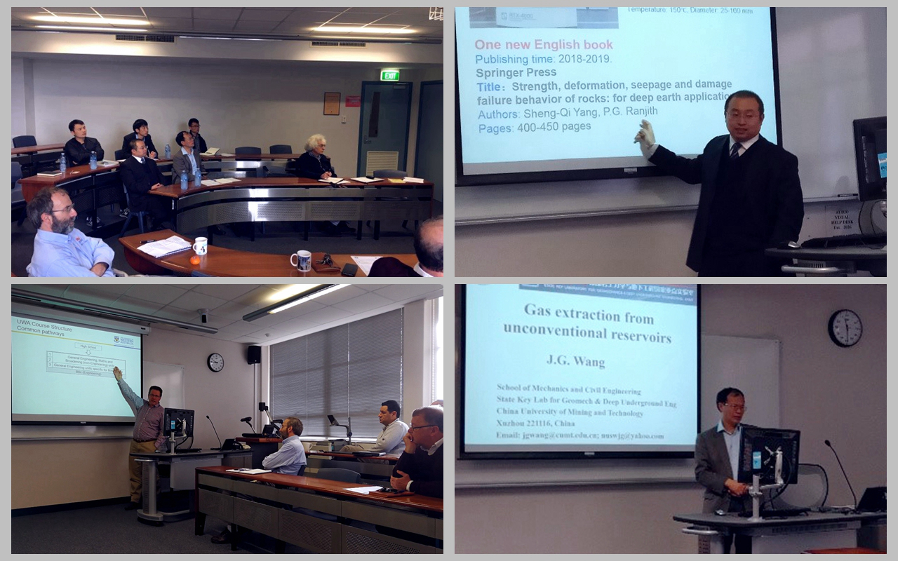 汇报交流阶段,中方杨圣奇教授与王建国教授分别作了题为“Strength, deformation, seepage and damage failure behavior of rocks: for deep earth applications”与“Gas extraction from unconventional reservoirs”的邀请报告。澳方Andy Fourie教授、Arcady Dyskin教授、Yves Potvin教授、Hakan Basarir副教授及Ali Karrech副教授分别作了题为“Tailings and backfill research at UWA”、“Rock failure, fracture growth and wave propagation in rock mass”、“The Australian Centre for Geomechanics – An overview of activities”、“The use of measurement while drilling (MWD) data for the prediction of rock mass properties”及“Description of fractal damage in geo-materials”的学术交流报告。另有4名毕业于国产无码