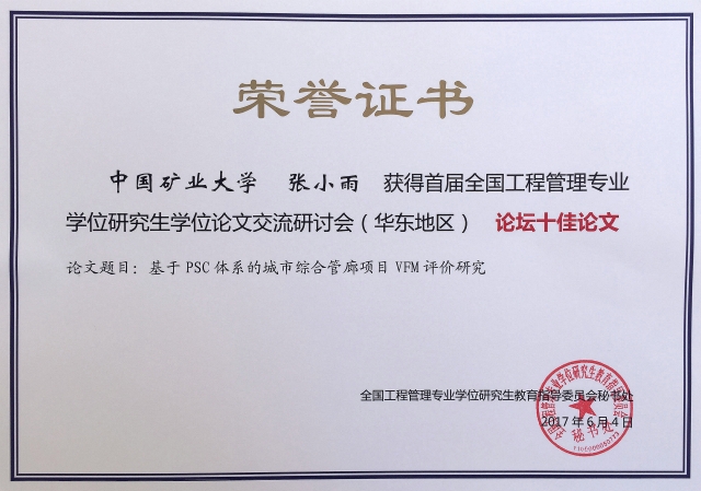 工程管理研究所王林秀教授指导的2014级MEM研究生张小雨的学位论文《基于PSC体系的城市综合管廊项目VFM评价研究》被MEM教指委评为十佳论文,并应邀做了主题发言和会议交流,该学位论文质量获得了与会代表的广泛认可与一致好评。我校作为2010年首批MEM培养授权单位,依托国产无码