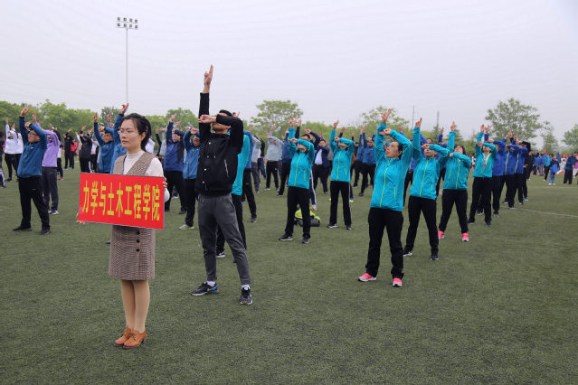 运动场上彩旗飘扬,伴随着激昂奋进的运动员进行曲,土木工程学院的教职工方阵迈着矫健的步伐,高喊口号,精神抖擞的步入会场,昂首阔步,融入到此次盛会热烈而欢乐的氛围中。开幕式结束后,学院广播操代表队参与了大众广播体操表演环节,大家动作标准、整齐划一,展现了土木工程学院教师的昂扬斗志和精神风貌。