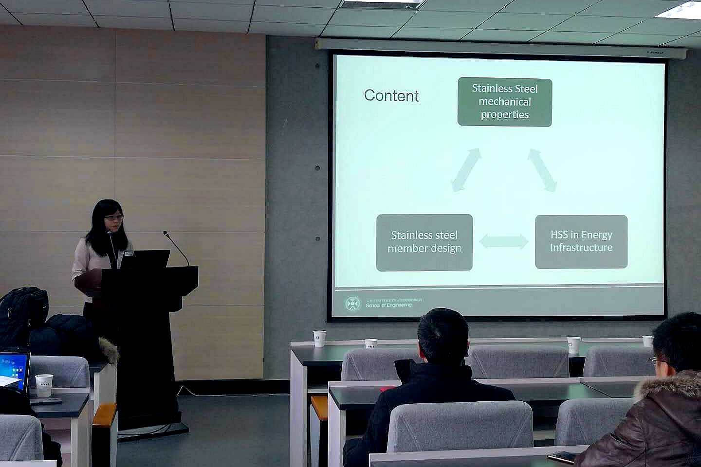 开展学术交流。访问期间,黄博士在深部岩土力学与地下工程国家重点实验室305报告厅举办了学术报告,报告题目为“Structural Performance and Design of Stainless Steel and High-Strength Steel Members”。报告主要介绍了常(高)温下不锈钢应力-应变本构模型、不锈钢与高强钢构件力学性能试验、数值模型和相关设计理论研究等。在座师生与黄博士就不锈钢构件火灾行为及其工程应用等方面进行深入热烈的交流与讨论。报告会由张营营教授主持。最后,黄博士参观深部岩土力学与地下工程国家重点实验室、结构工程实验室及火安全实验室等,并提出一些建议。