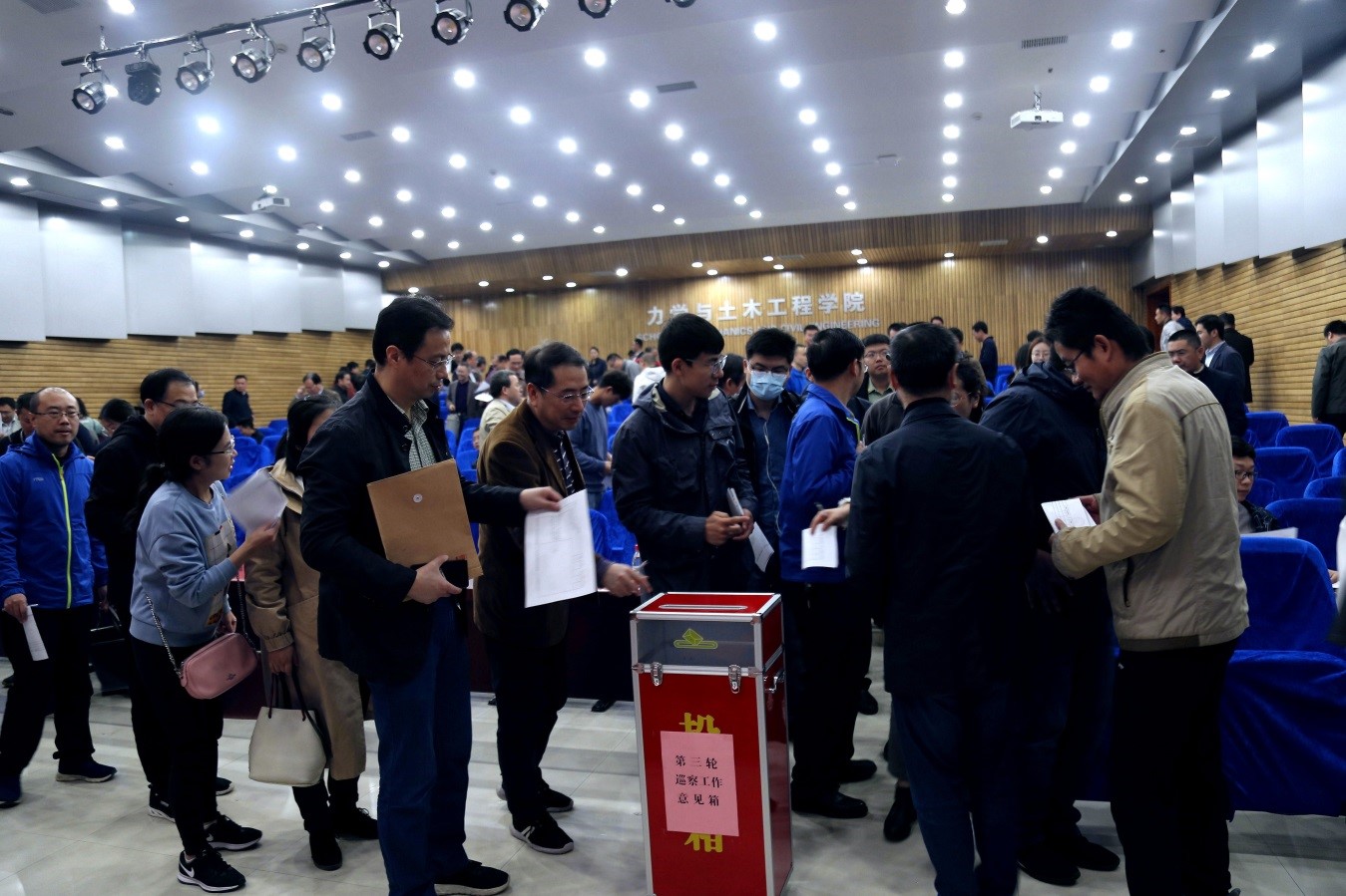 动员会上,工作人员向学院参会人员发放了调查问卷,参会人员填好后将调查问卷投入投票箱。动员会后,高顶书记代表学院党委就自查情况向巡察组成员进行现场汇报。