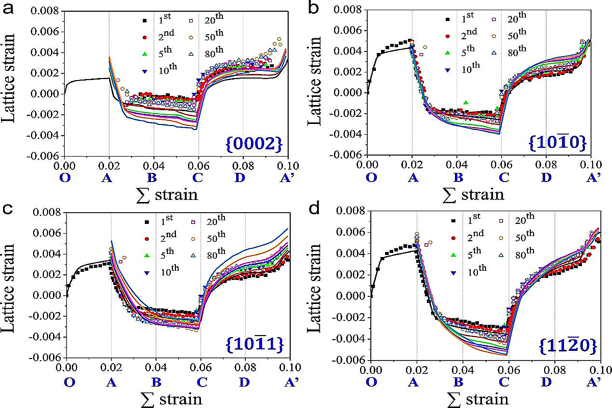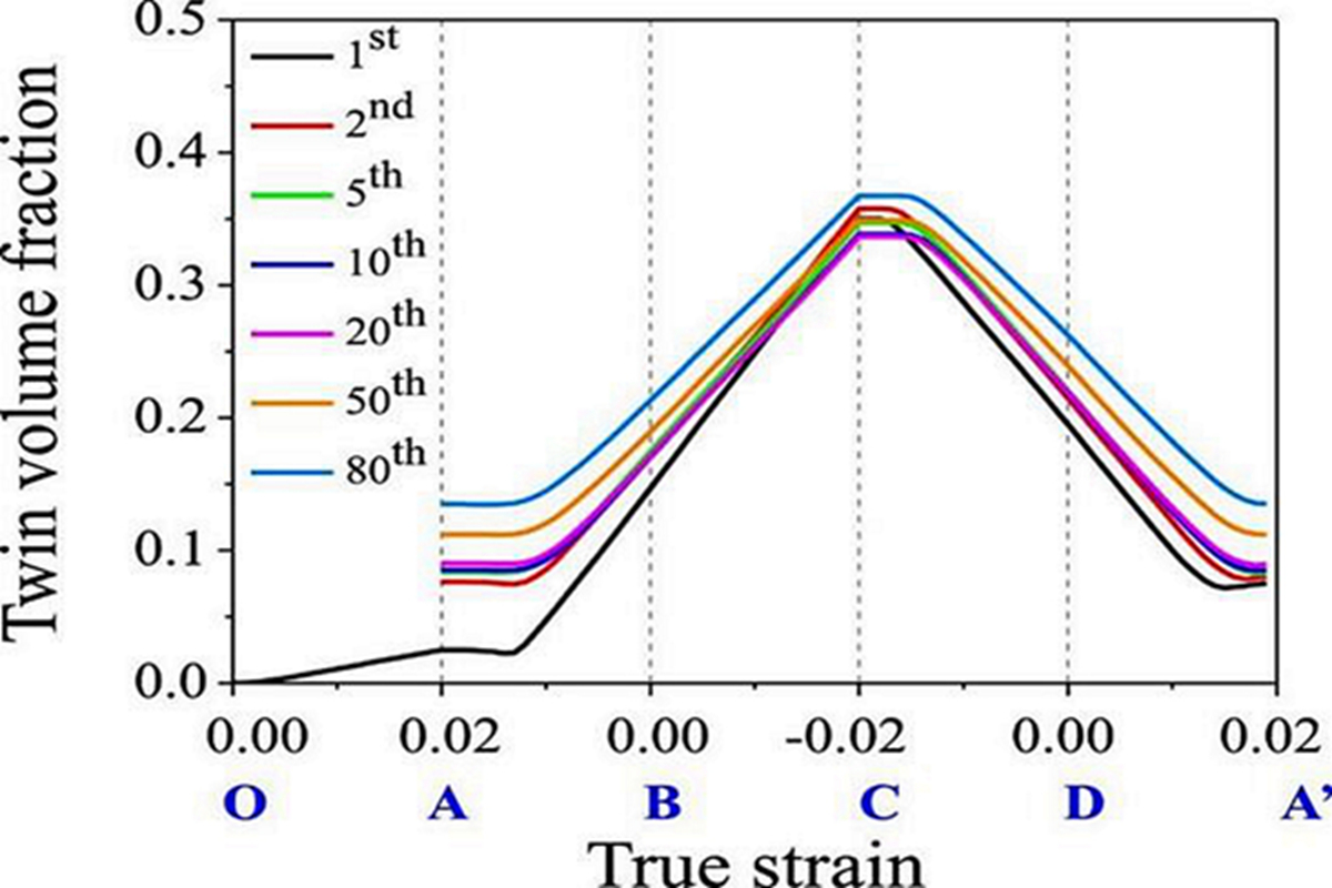 郭晓倩副教授课题组,采用考虑孪生与退孪生行为的弹粘塑性自洽(EVPSC-TDT)模型模拟了AZ31镁合金沿RD方向应变幅值为±2%条件下的低周疲劳行为,通过对比实验测得的应力-应变曲线、峰值应力和孪生体积分数等验证模型的有效性。 此外,首次预测了镁合金全周期疲劳过程中晶格应变演化规律,并结合中子衍射实验结果,揭示了镁合金循环变形中的孪生-退孪生行为及循环硬化机理。研究还发现在疲劳循环过程中,最大孪晶体积分数随疲劳循环次数呈现出“先增加-后减小-再增加”的变化趋势。这一发现纠正了先前认为最大孪晶体积分数在初始阶段增加-后期趋于饱和的观点。基于模拟结果对循环硬化机理也提出了新的见解:压缩阶段的循环硬化主要与不可逆位错导致的孪晶界固化和残余孪晶的产生相关,而滑移与孪晶的相互作用是引起拉伸阶段循环硬化的主要原因。