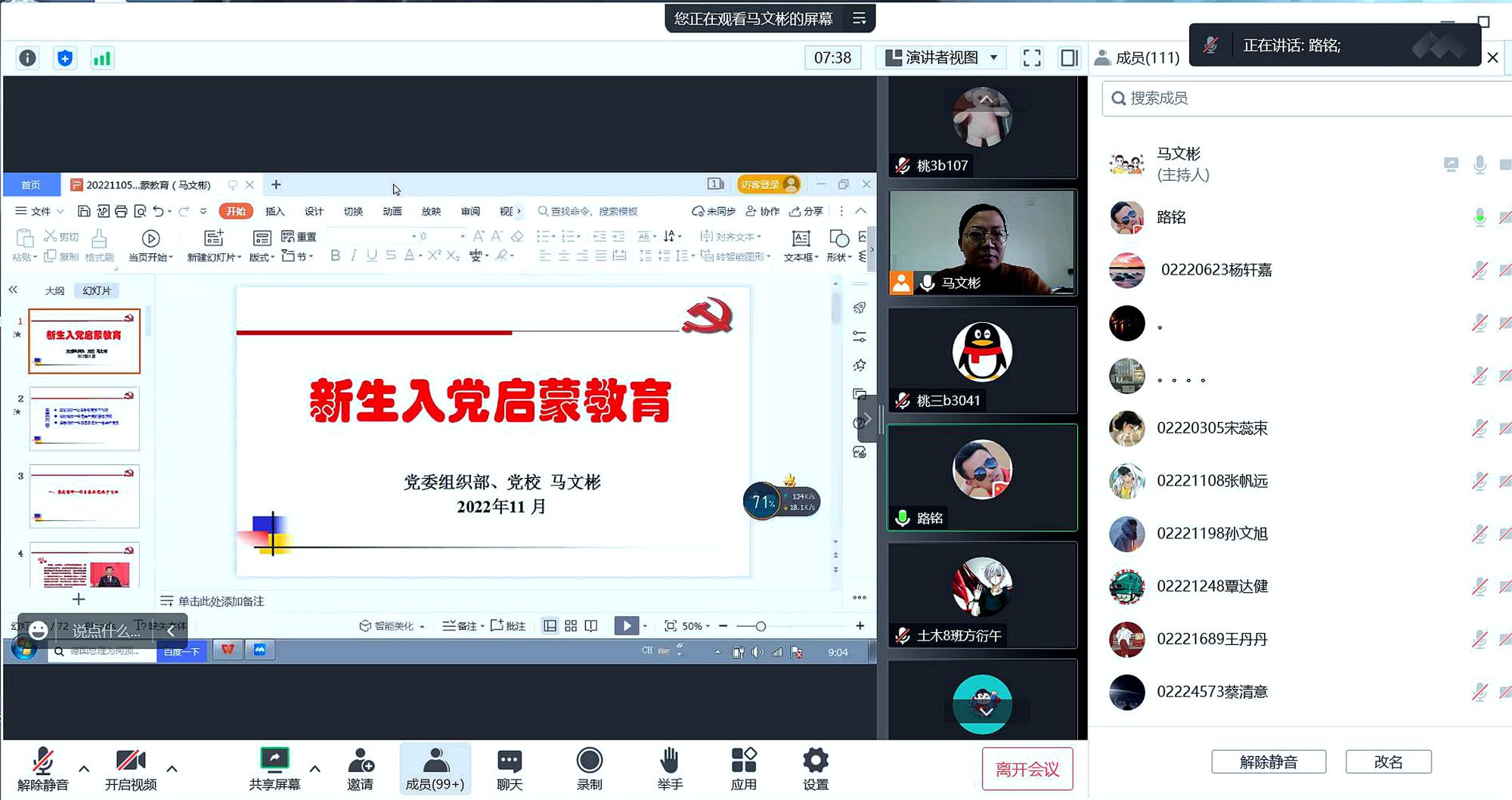 11月5日上午,学院邀请校党委组织部、党校马文彬老师在线上为2022级本科生进行入党启蒙教育,本次讲座由辅导员路铭老师主持,国产无码