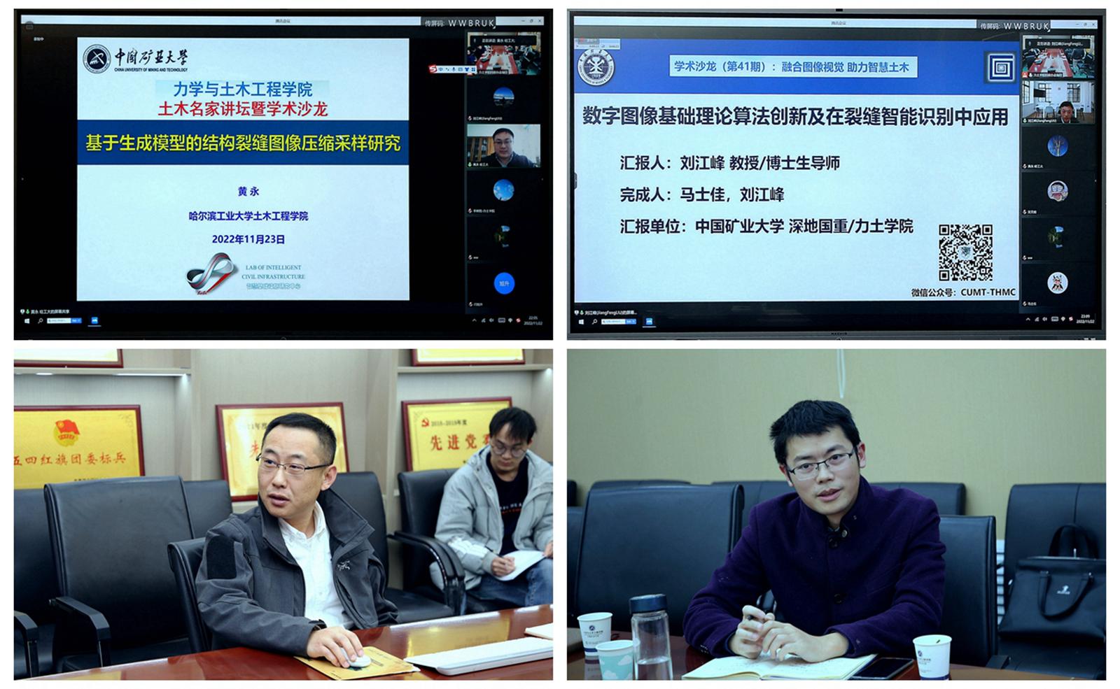 沙龙邀请深部岩土力学与地下工程国家重点实验室研究员刘江峰老师、学院郭震、王高新老师分别做了《数字图像技术基础理论创新及在裂隙(缝)智能识别中应用》、《基于视觉技术的混凝土裂缝量化识别方法》、《基于双目视觉的桥梁结构三维重构及智能测量》的报告。刘江峰老师指出了数字图像基础算法的创新之处,并阐述了基于数字图像裂缝智能识别、提取和测算,并且对裂缝识别、检测系统和装备研发进行了介绍。郭震老师尝试了多模主动式红外成像无损检测,能够解决被测表面辐射率、环境温度、相对湿度、测量距离等因素对热成像仪成像的影响。王高新老师提出基于双目成像的桥梁缺陷尺寸自动测量技术,能够实现缺陷自动测量、三维动态呈现、全方位检测,形成新的土木结构表观缺陷自动测量装备。