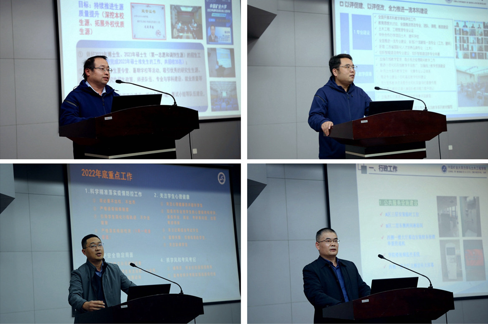 党委副书记李智、副院长杨圣奇、张营营、副院长周劲锋分别就自己分管的工作在会上做了报告,总结2022年工作的同时对2023年工作重点进行规划和布置。党政办主任孟燕汇报了《超工作业绩津贴办法》新修订内容。