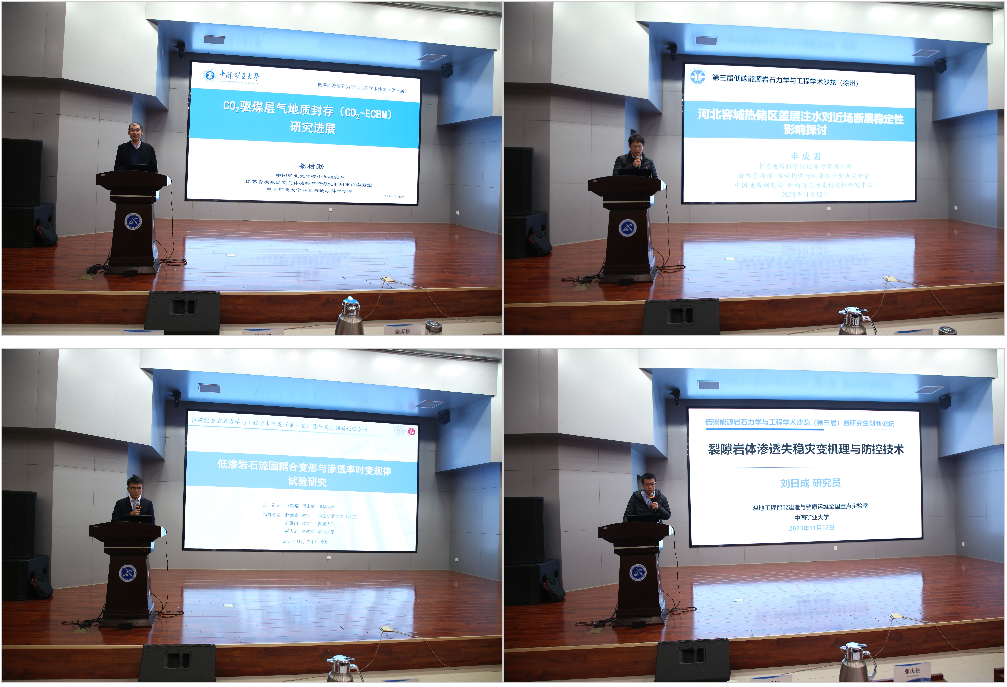 学术交流环节,邀请了梅生伟教授、周辉研究员、赵季初正高级工程师、刘建峰教授、桑树勋教授、丰成君正高级工程师、刘日成研究员、赵耀耀博士后,分别做了“盐穴资源综合利用”、“跨活断层隧道蠕滑断错与防控物理模拟试验”、“山东省深部咸水层二氧化碳封存与空气储能试验”、“深部储层裂缝渗流的多尺度模拟”、“CO2驱煤层气地质封存研究进展”、“河北容城热储区盖层注水对近场断裂稳定性影响探讨”、“裂隙岩体渗透失稳灾变机理与防控技术”、“低渗岩石流固耦合变形与渗透率时变规律试验研究”等8个特邀报告。