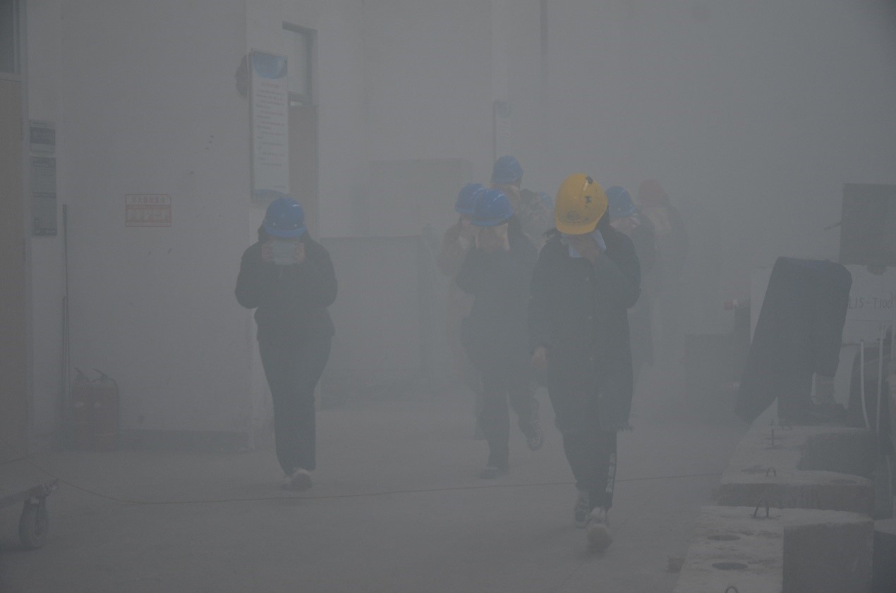 第一项为南湖结构实验室师生进行紧急疏散逃生演练。该项演练是模拟在火灾、地震等紧急情况下,师生按照防护要领和应急预案的既定路线从实验室现场快速疏散至安全区域。演练伊始,保卫处工作人员在结构大厅投放烟雾,一时硝烟弥漫,警铃四起,在各实验室及大厅工作的师生使用蘸水毛巾捂住口鼻,在疏散引导员的指引下,低身弯腰,沿大厅安全通道东侧的空地上撤离。参加紧急逃生演练的师生疏散撤离快速、有序。