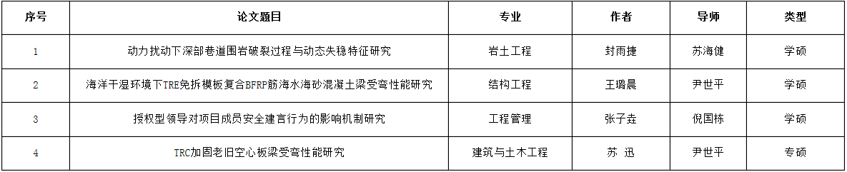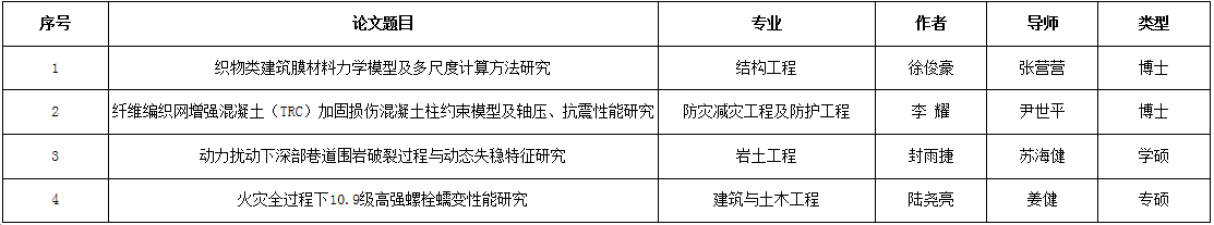 获评4篇,其中,徐俊豪同学(导师:张营营教授)、李耀同学(导师:尹世平教授)的学位论文获评优秀博士学位论文,封雨捷同学(导师:苏海健副教授)、陆尧亮同学(导师:姜健教授)的学位论文获评优秀硕士学位论文。