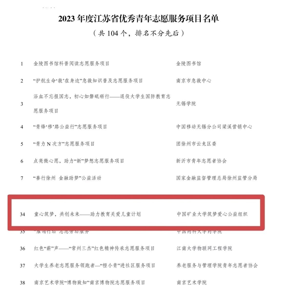 筑梦爱心公益组织推出的志愿服务项目“童心筑梦,共创未来——助力教育关爱儿童计划”在此次评选中荣获“2023年度江苏省优秀青年志愿者服务项目”荣誉。