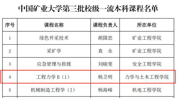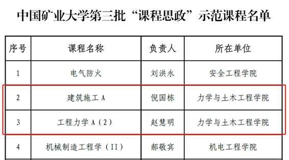 日前,学校发布了《关于公布我校第三批“课程思政”示范课程评选结果的通知》(中矿大教字〔2024〕17号)和《关于公布我校第三批校级一流课程认定结果的通知》(中矿大教字〔2024〕18号),学院2门课程被认定为校级“课程思政”示范课程,1门课程被认定为校级一流本科课程,具体名单如下: