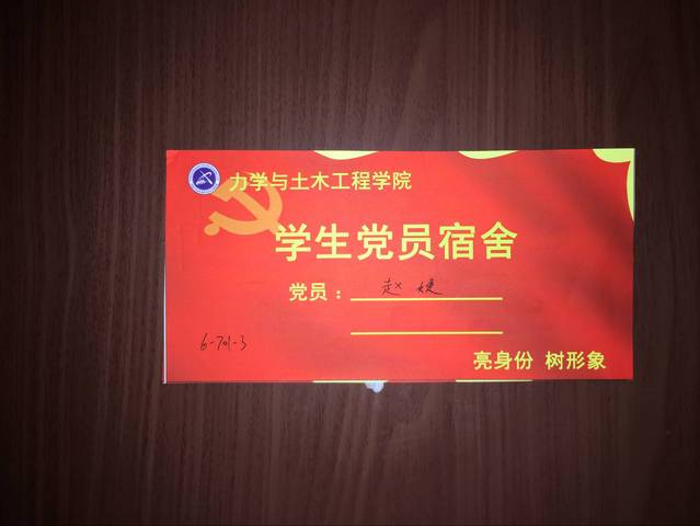 为更好地推进土木学院学生宿舍的管理工作,充分发挥学生党员的先锋模范带头作用,激发学生党员“争优、创先”的进取精神,营造“全面参与、全员监督”的学生党建工作氛围,2018年4月,土木学院党委开始推行学生党员宿舍挂牌制度。