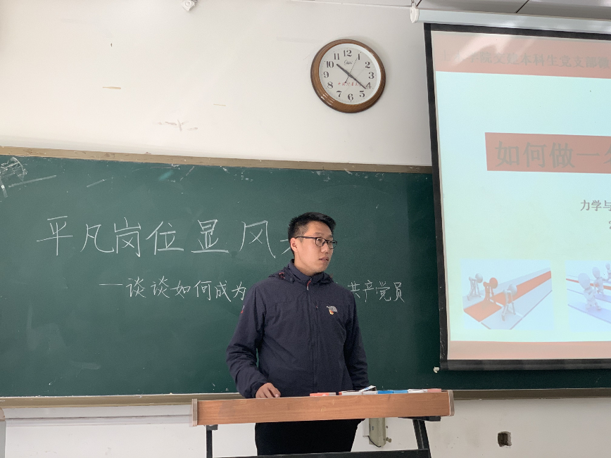 首先,党支部书记李亮老师针对本次党课主题“平凡岗位显风采--如何做一名优秀的共产党员”,分别从思想、奉献、纪律等八个方面,讲述在平常生活中如何提高党员的自我修养,做一名优秀的党员。随后,兼职辅导员潘珊珊老师结合自身成长讲述如何成为一名优秀的学生党员。最后,党支部全体成员参与讨论,两名预备党员分享了自己“如何成为一名优秀的党员,起到带头模范作用”的切身感受。