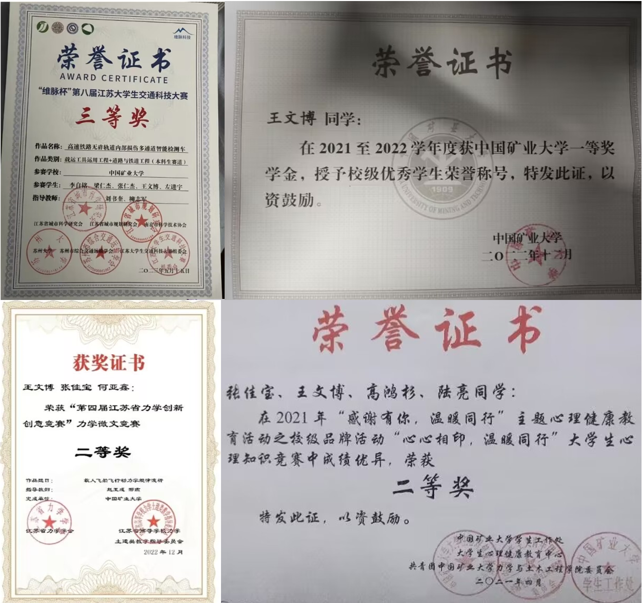 刚进入大学,王文博就定下了保研的目标,明确了自己所学专业的内容,在对专业有充分了解的基础上,认真学习自己的专业课程,并取得优异的成绩。在大学生活方面,王文博希望自己能有一个丰富多彩的大学生活,他积极参加校园的各类志愿活动以及学术上的竞赛。王文博表示:“不管是生活,学习,思想,人际关系,工作等等,都要全面发展,全力以赴。”因为这种积极进取的心态,王文博在大学生活中获得了许多奖项,2023年获江苏省交通科技竞赛三等奖,2022年获江苏省力学创新创意竞赛微文组二等奖等。2020-2023年连续获得校级奖学金,2021-2022学年校优秀共青团员,2021年获校优秀青年志愿者。