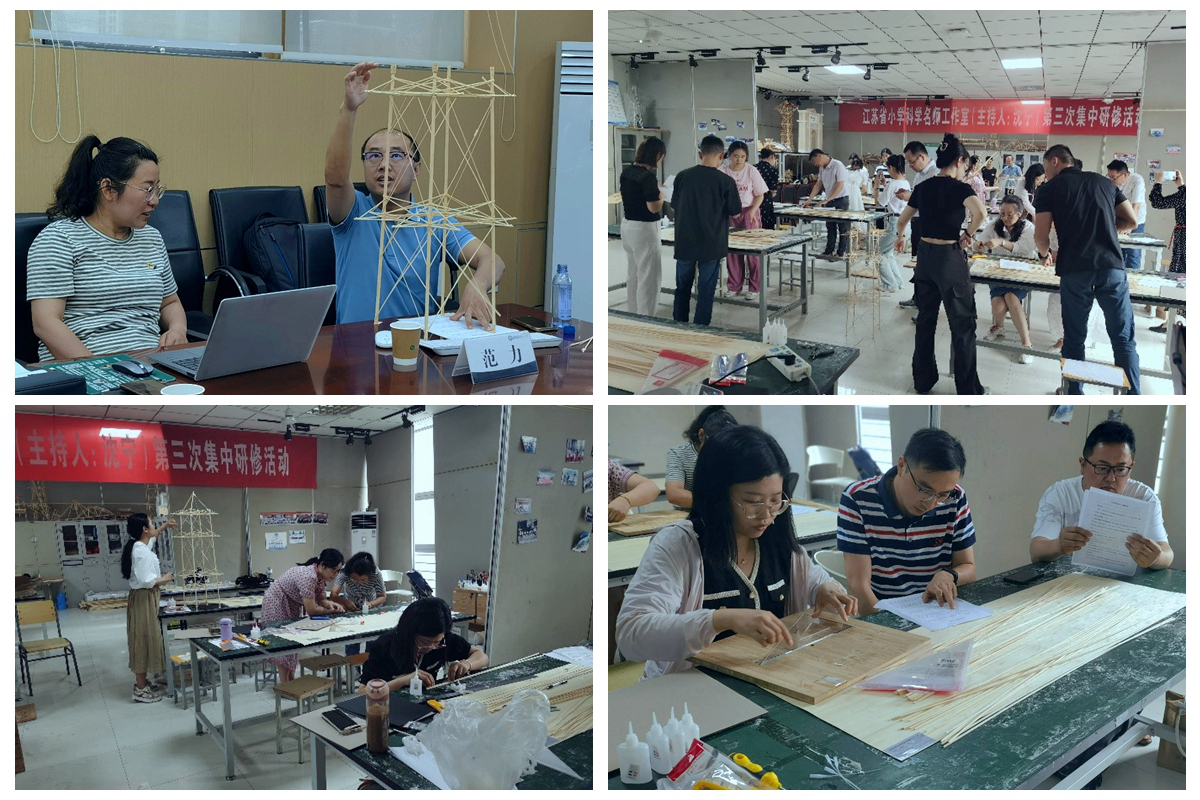 下午一点,进行工程结构模型的设计与制作体验环节。参与教师共分8组,进行塔架模型的制作与加载体验。教师们在制作中体验塔架结构的杆件组成、受力变形特点,思考如何让结构更加牢固、承受的荷载更大等问题。教师们在自己动手操作的过程中,也能够将真实的感受传递到小学科学的教学中,让孩子们能够深刻理解何为“工程”,起到了科学教学与工程实践的良好融合。