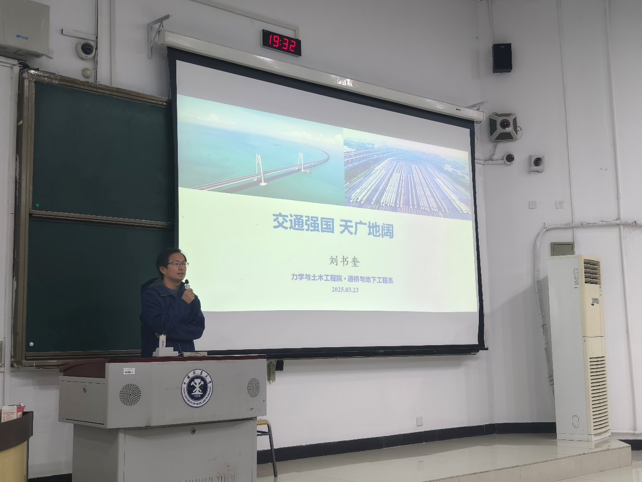随后,道桥与地下工程系主任刘书奎为同学们讲述了交通强国战略的提出背景与重大意义,系统介绍了相关专业定位与培养体系,为同学们详细介绍道桥与地下工程系相关情况,指出道桥系始终坚持以服务国家交通基础设施建设为己任,致力于培养具备扎实理论基础、过硬实践能力和创新精神的高素质人才。同时也介绍了往届优秀毕业生的就业情况,在公路、铁路、城市道路、轨道交通、桥梁、隧道等多领域从事规划、设计、施工、管理等工作,为国家交通事业发展贡献力量。