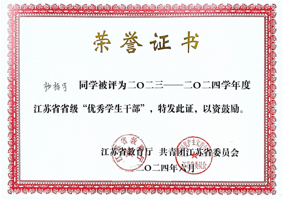 大学的生活不只有学习,杨栋宇还热衷于学生工作,他说:“因为热爱,所以选择担当”,大学期间杨栋宇曾担任院学生会执行主席,本科生2021级综合党支部副书记,班级班长,辅导员助理等五项学生职务,任职期间,他全心投入,协助老师筹备各类大型会议活动,成功举办学院迎新、文艺晚会等赛事和活动。在他的带领下,2023 - 2024学年院学生会荣获“标兵学生会”称号,且排名全校第一,他所在班级也多次获评优秀团支部、四星级班集体。与此同时,他热心参与文体和志愿活动,志愿服务时长累计约400小时,收获江苏省省级优秀学生干部等60余项荣誉。