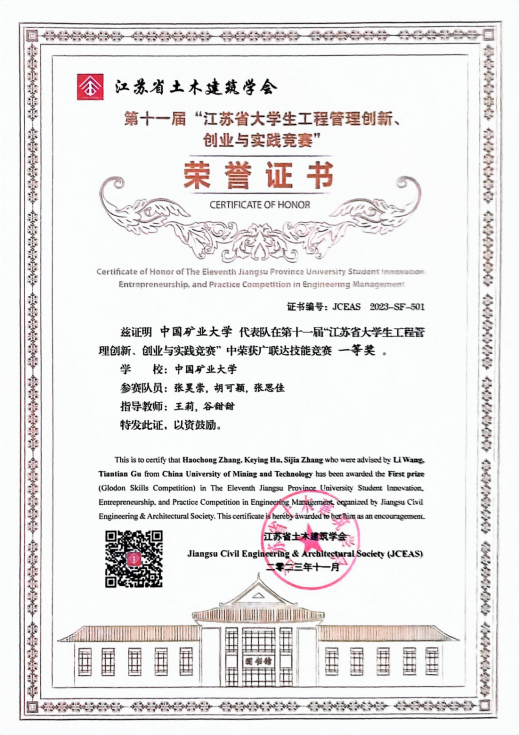 第十一届 “江苏省大学生工程管理创新、创业与实践竞赛” 广联达技能竞赛一等奖