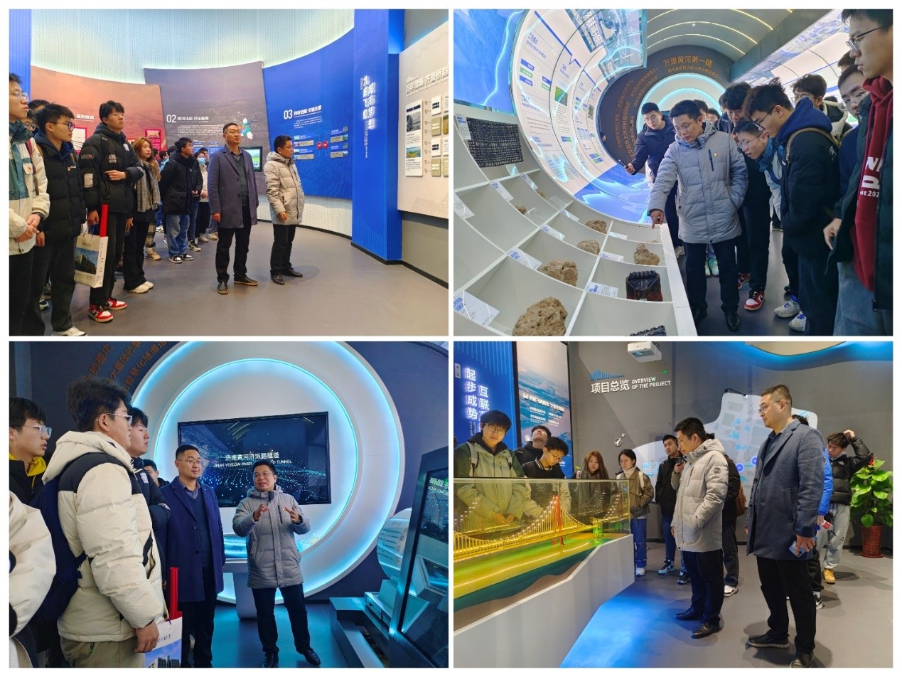 师生代表一行首先实地参观了济南城市建设集团“四桥四隧”跨黄通道项目展厅,在讲解员的带领下学习了解济南市“四桥四隧”规划建设的工程概况、工程难点、工程亮点和战略意义。随后,师生代表们走进中铁十四局集团有限公司济泺路穿黄北延隧道在建项目,实地参观学习穿黄隧道的施工原理、在建现状和盾构机工作原理,详细听取项目负责人对隧道首次跨越地上悬河风险、黄河大堤保护标准、大盾构机掘进原理、盾构隧道施工技术等方面的科研进展和研究成果介绍。