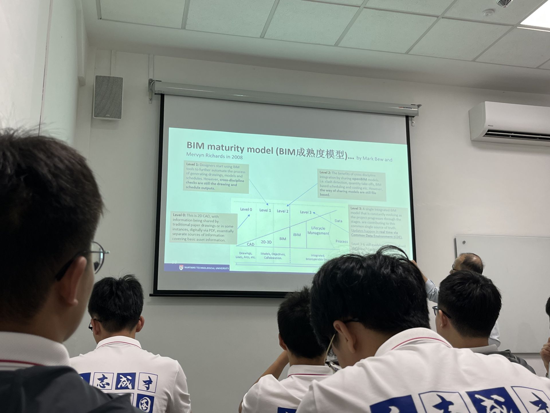 当日清晨,钱七虎班赴南洋理工大学,在有着接近30年历史的华裔楼内,同学们聆听来自南洋理工大学土木与环境工程学院的Robert LK Tiong教授的课程。在课堂中,Tiong教授详细介绍了BIM技术在建筑行业中的重要性及其实施的多方面内容,包括BIM的基本概念和优势,数字孪生的应用,以及政府在推动BIM普及方面的作用。同学们积极与教授交流自己的感想,课堂气氛轻松愉快。听完Tiong教授的精彩课程,同学们深受启发,收获颇丰。BIM技术的前沿性及其多方面显著优势,让同学们对建筑行业的未来充满了期待。