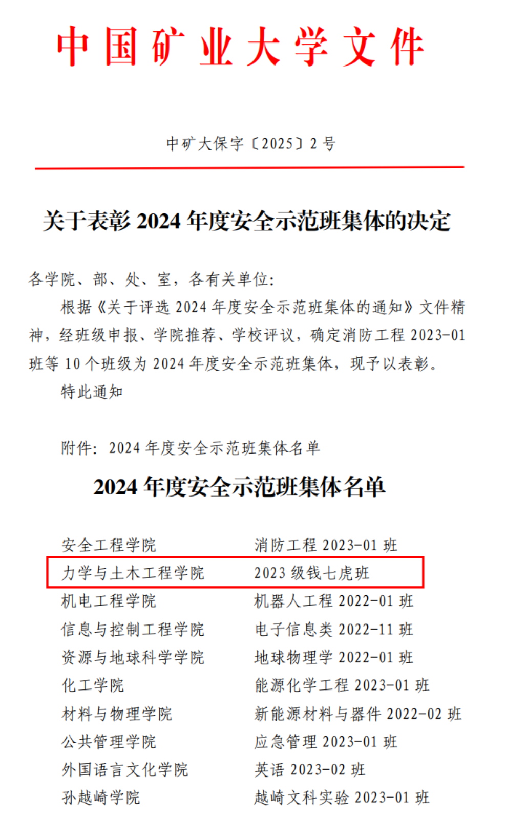 近日,学校发布了《关于表彰2024年度安全示范班集体的决定(中矿大保字[2025]2号)》文件。经班级申报、学院推荐、综合评议等环节,学校决定授予10个班级“国产无码